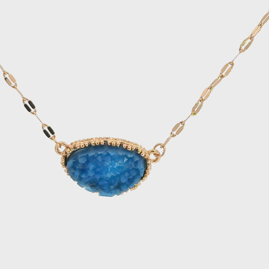 Indulge in the understated elegance of this gold chain necklace, featuring a captivating oval-shaped crystal. The cabochon-cut crystal showcases a mesmerizing blue hue, adding a touch of sophistication to any ensemble. A timeless piece for the discerning jewelry lover.